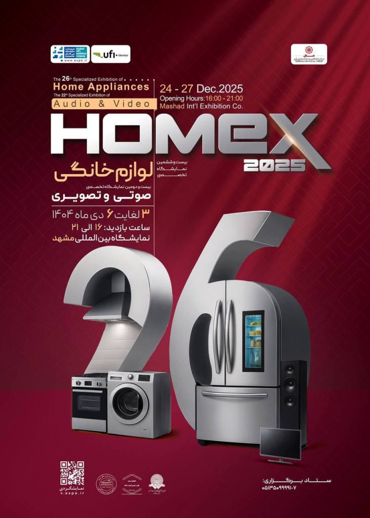 بیستوششمین نمایشگاه تخصصی لوازم خانگی، صوتی و تصویری از ۳ لغایت ۶ دیماه ۱۴۰۴ در محل نمایشگاه بینالمللی مشهد برگزار میشود که این رویداد از ساعت ۱۶ الی ۲۱ پذیرای بازدیدکنندگان، فعالان صنعت و علاقهمندان خواهد بود.